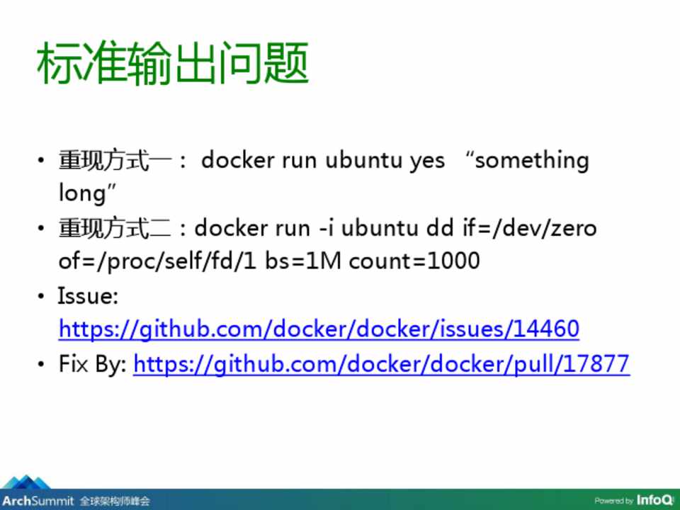 • Docker 1.9.1 版本以下,容器标准输出输出大量 数据,会导致内存泄露,从而导致 Docker Daemon crash