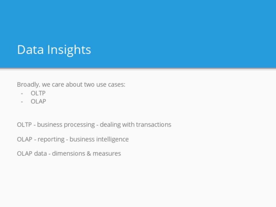 OLTP - business processing - dealing with transactions OLAP - reporting - business intelligence OLAP data - dimensions & measures