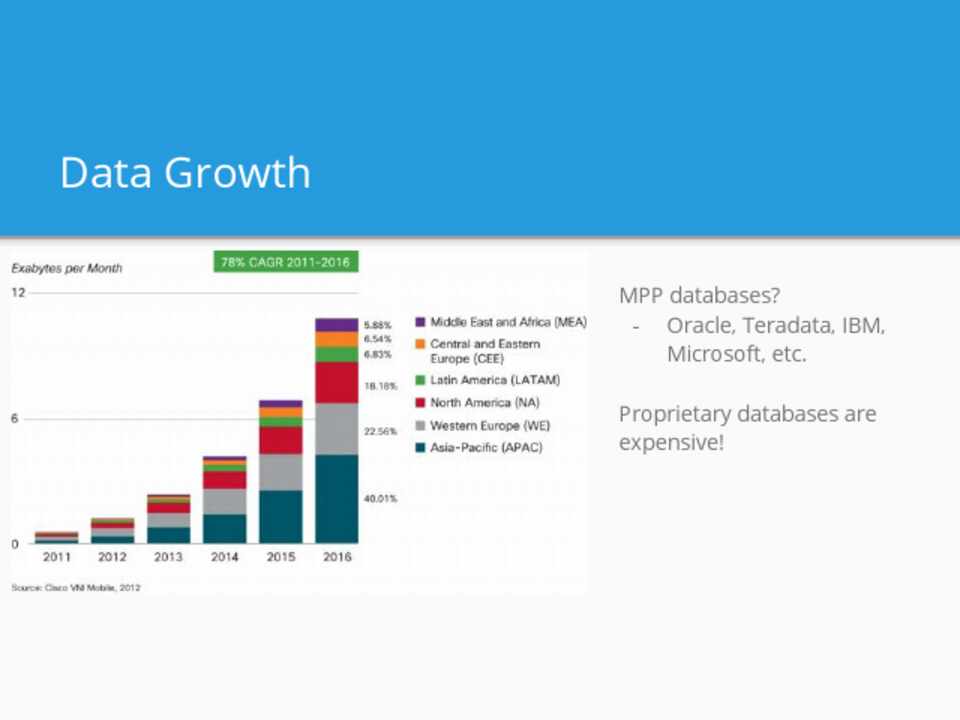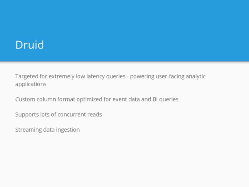 Targeted for extremely low latency queries - powering user-facing analytic applications Custom column format optimized for event data and BI queries Supports lots of concurrent reads Streaming data ingestion