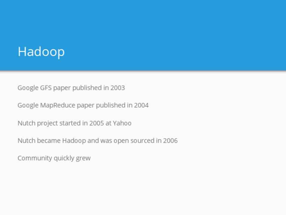 Google GFS paper published in 2003 Google MapReduce paper published in 2004 Nutch project started in 2005 at Yahoo Nutch became Hadoop and was open sourced in 2006 Community quickly grew