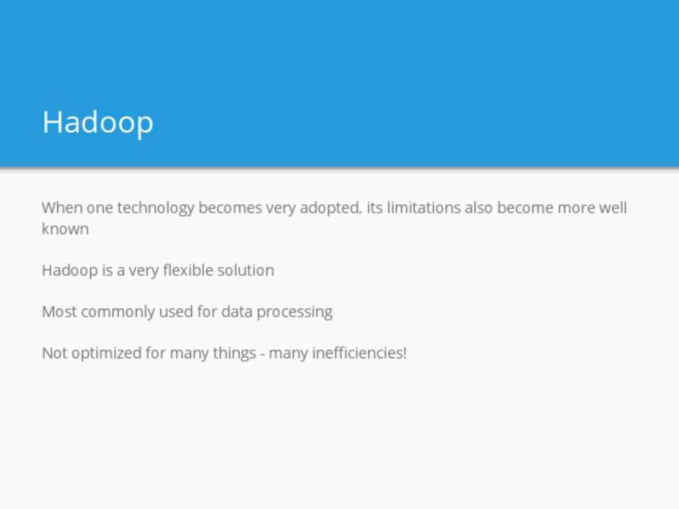When one technology becomes very adopted, its limitations also become more well known Hadoop is a very flexible solution Most commonly used for data processing Not optimized for many things - many inefficiencies!