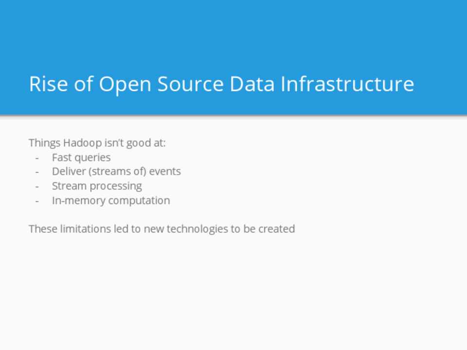 Things Hadoop isn’t good at: - Fast queries - Deliver (streams of) events - Stream processing - In-memory computation