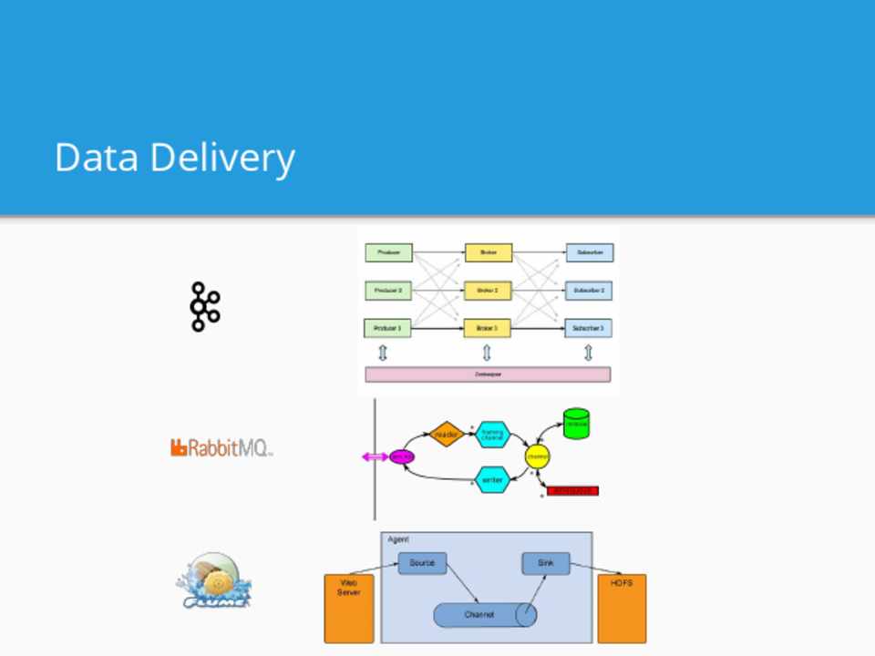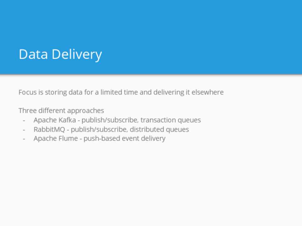 Three different approaches - Apache Kafka - publish/subscribe, transaction queues - RabbitMQ - publish/subscribe, distributed queues - Apache Flume - push-based event delivery