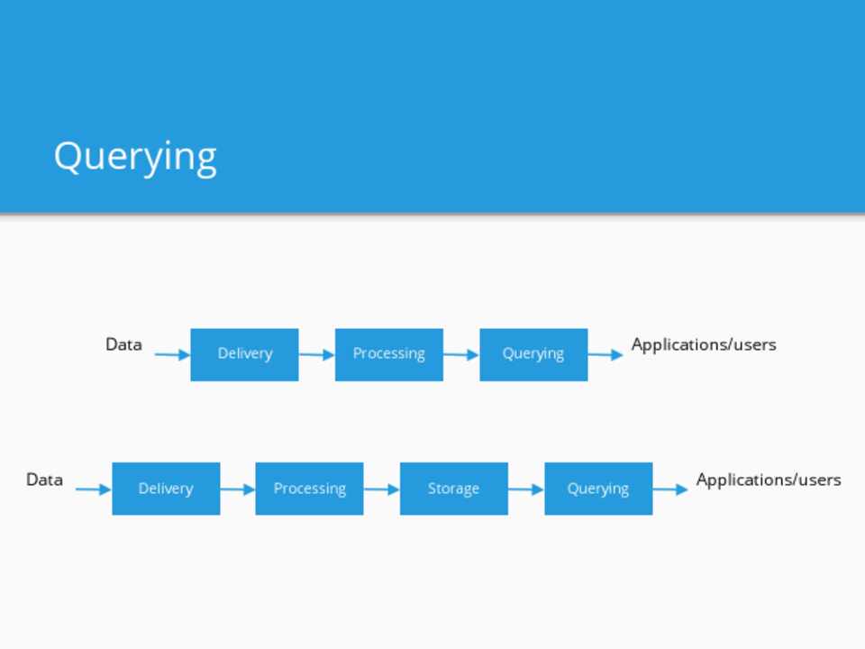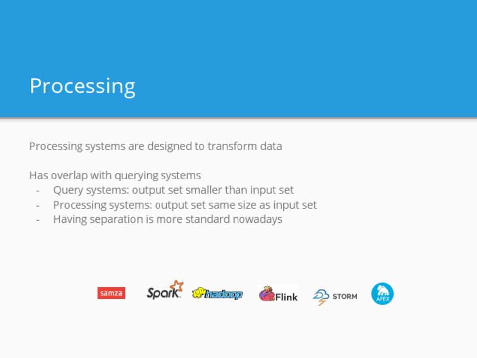 Has overlap with querying systems - Query systems: output set smaller than input set - Processing systems: output set same size as input set - Having separation is more standard nowadays