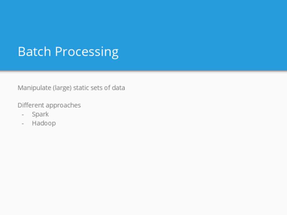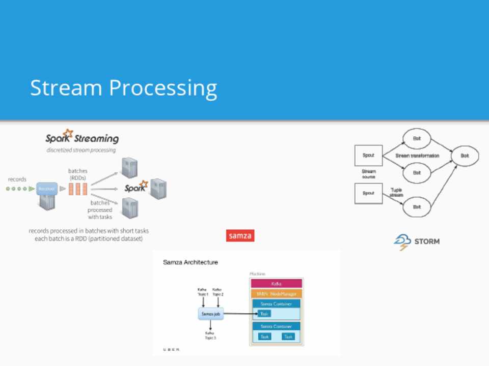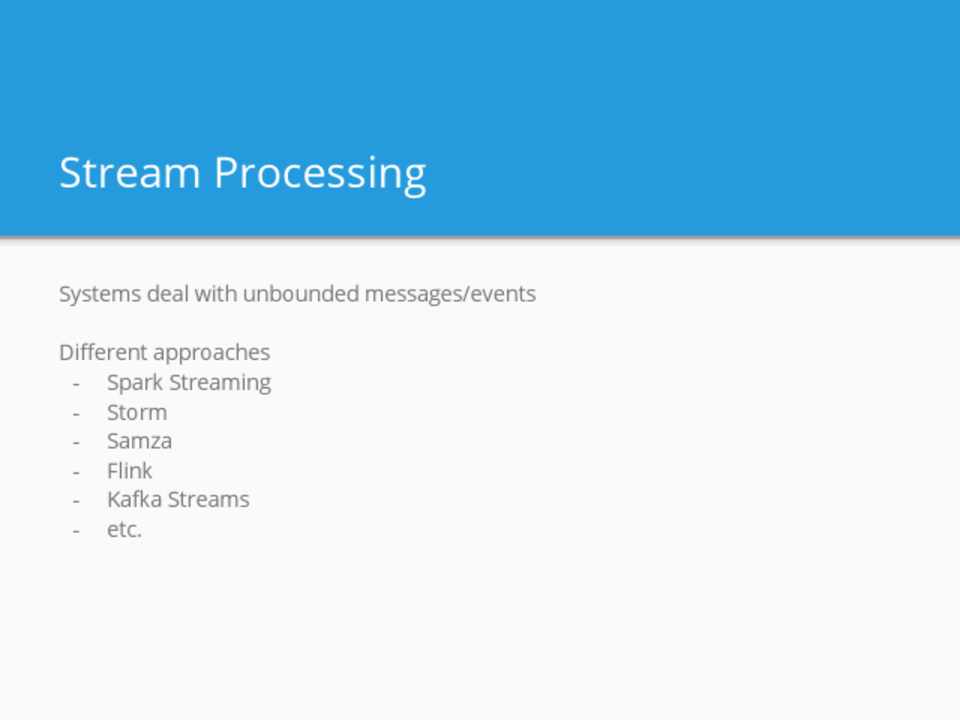 Different approaches - Spark Streaming - Storm - Samza - Flink - Kafka Streams - etc.