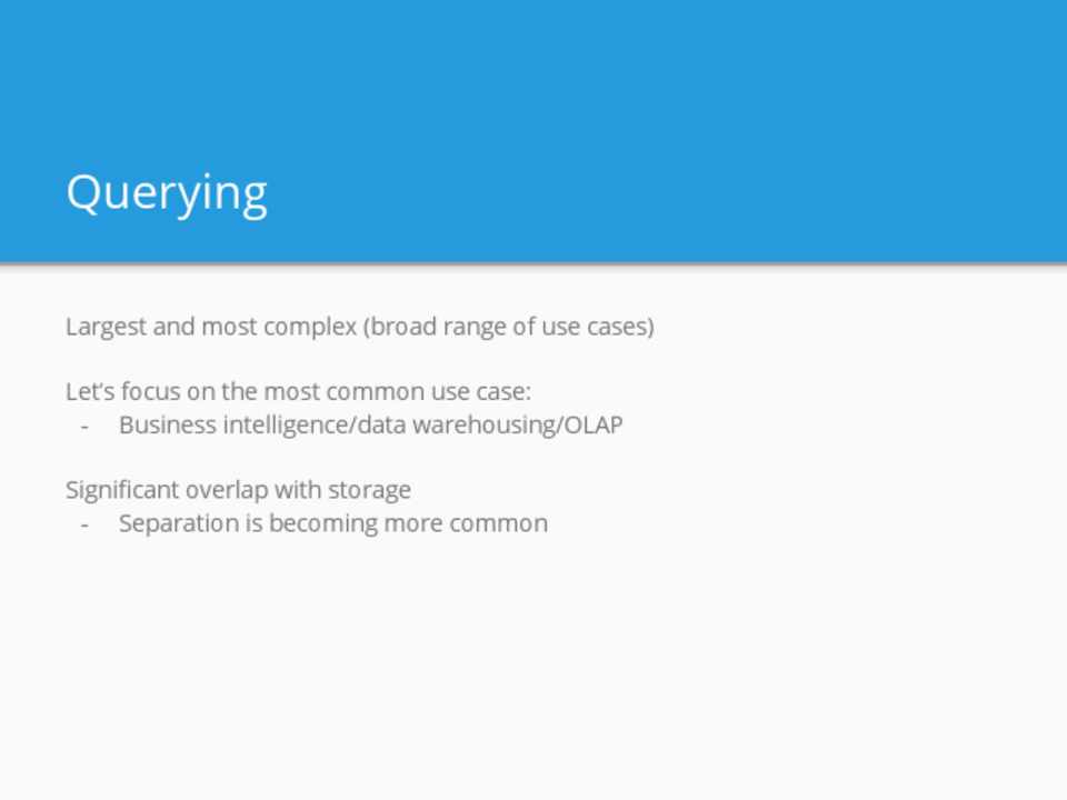 - Business intelligence/data warehousing/OLAP Significant overlap with storage