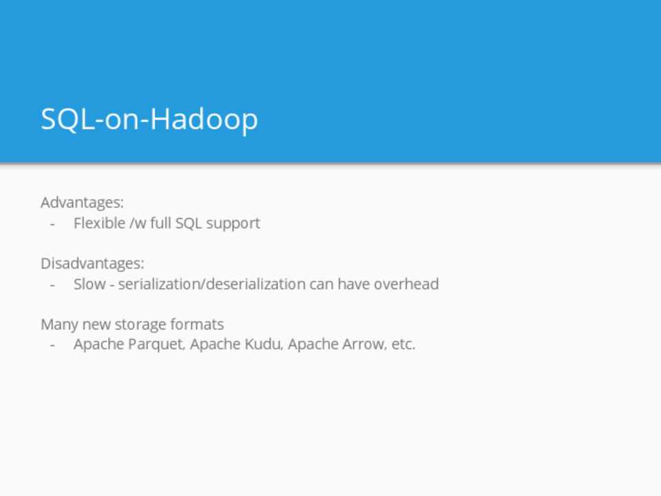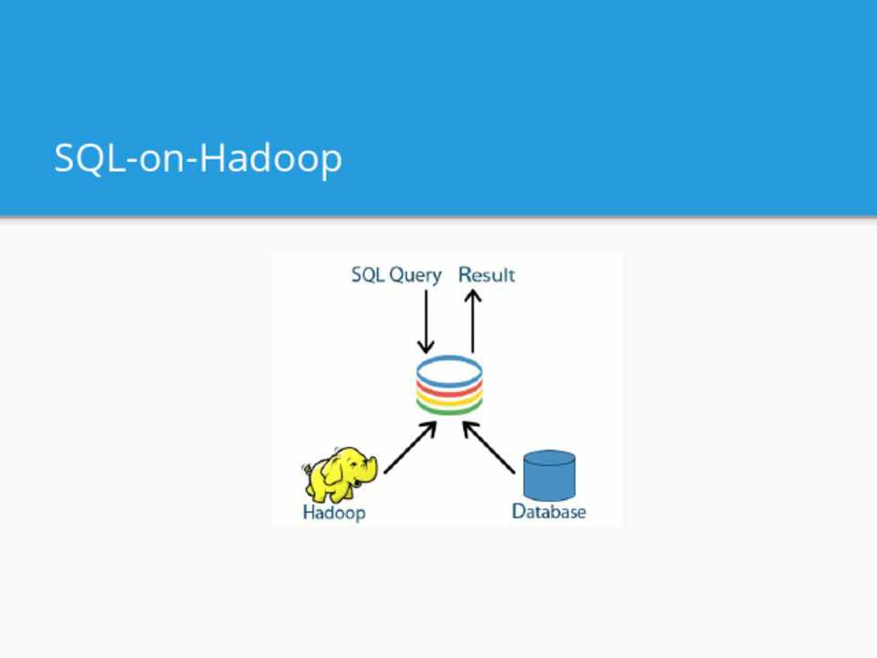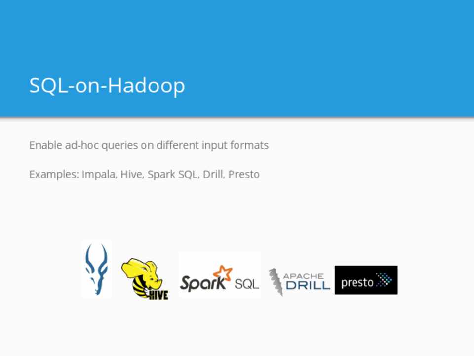Enable ad-hoc queries on different input formats Examples: Impala, Hive, Spark SQL, Drill, Presto