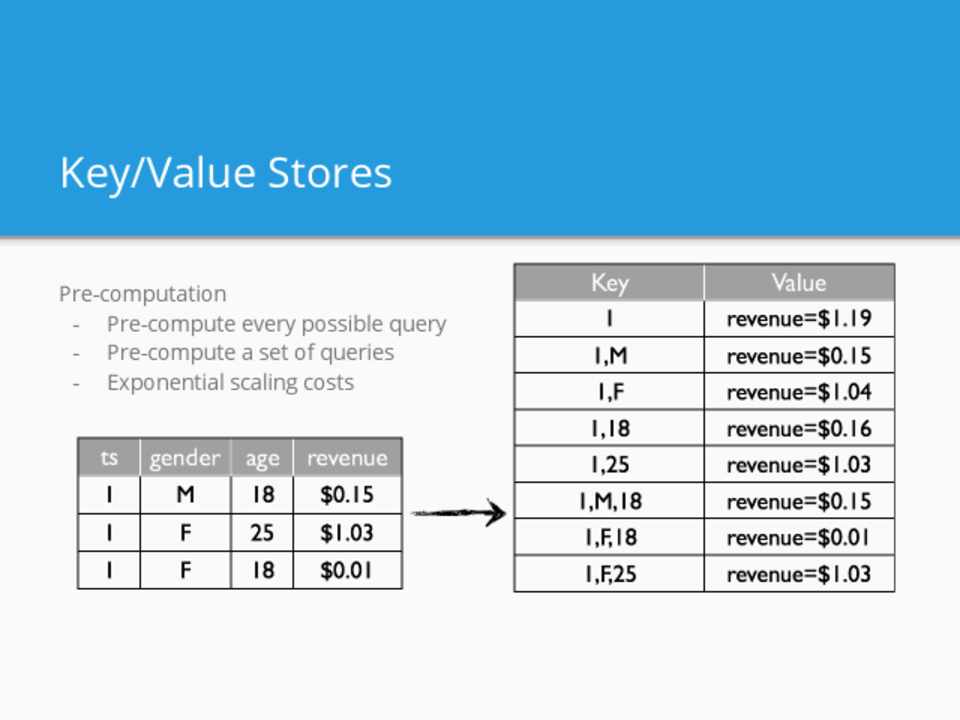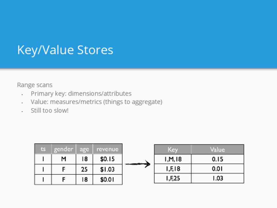 Range scans - Primary key: dimensions/attributes - Value: measures/metrics (things to aggregate) - Still too slow!