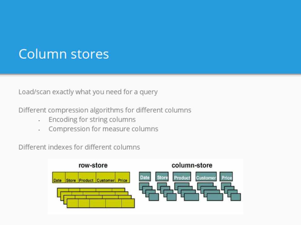 - Encoding for string columns - Compression for measure columns Different indexes for different columns