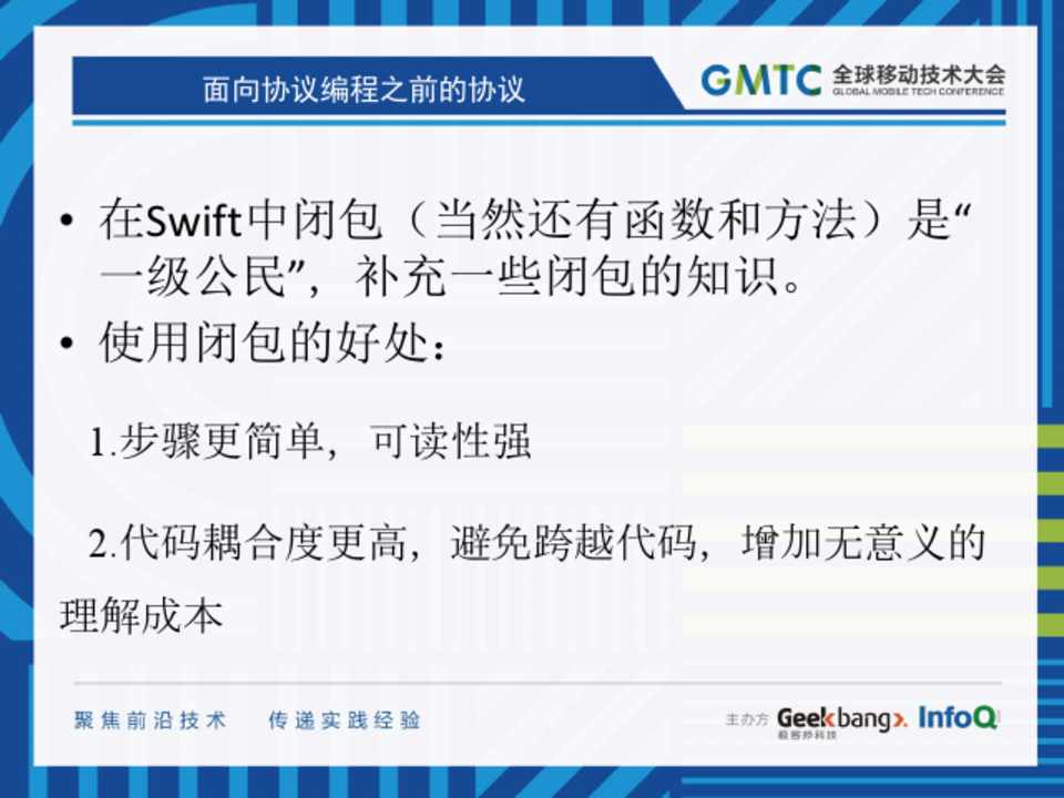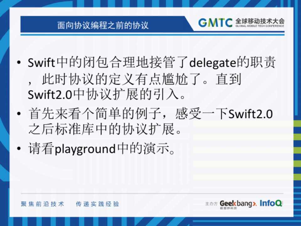 • Swift中的闭包合理地接管了delegate的职责 ,此时协议的定义有点尴尬了。直到 Swift2.0中协议扩展的引入。