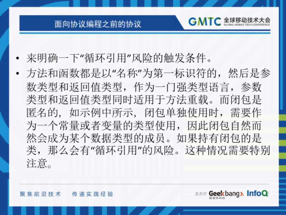 数类型和返回值类型,作为一门强类型语言,参数 类型和返回值类型同时适用于方法重载。而闭包是 匿名的,如示例中所示,闭包单独使用时,需要作 为一个常量或者变量的类型使用,因此闭包自然而 然会成为某个数据类型的成员。如果持有闭包的是 类,那么会有“循环引用”的风险。这种情况需要特别 注意。