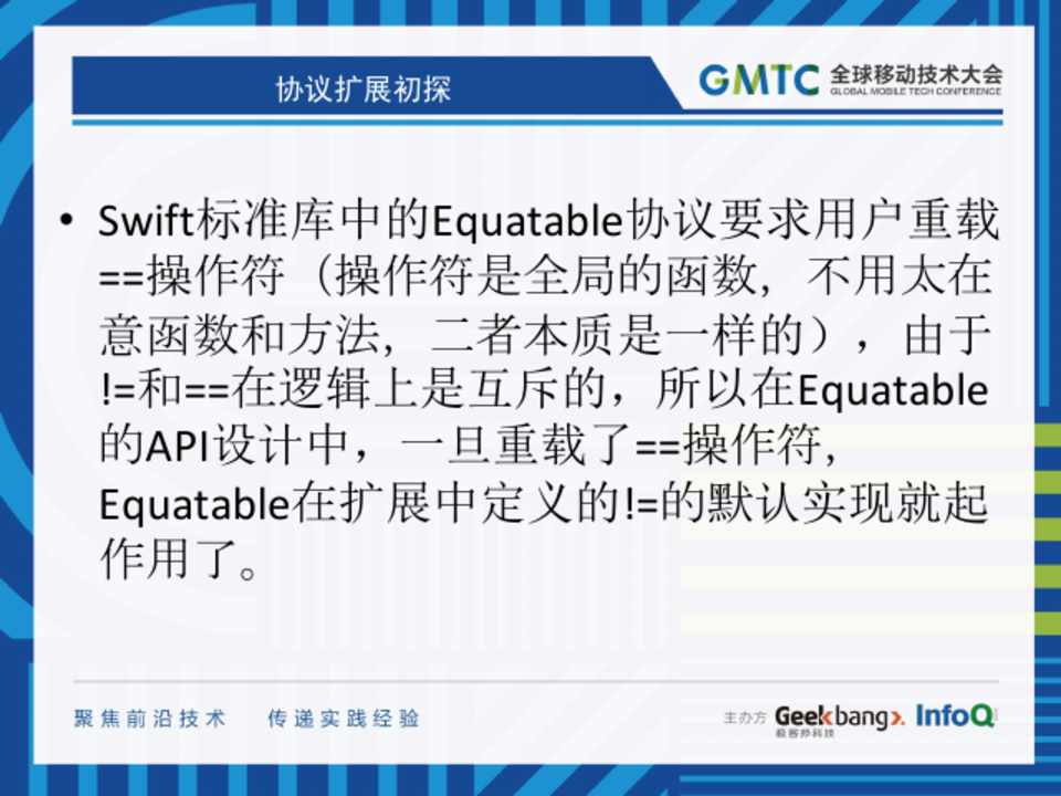 • Swift标准库中的Equatable协议要求用户重载 ==操作符(操作符是全局的函数,不用太在 意函数和方法,二者本质是一样的),由于 !=和==在逻辑上是互斥的,所以在Equatable 的API设计中,一旦重载了==操作符, Equatable在扩展中定义的!=的默认实现就起 作用了。