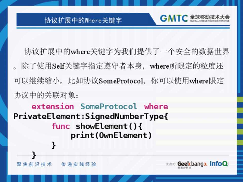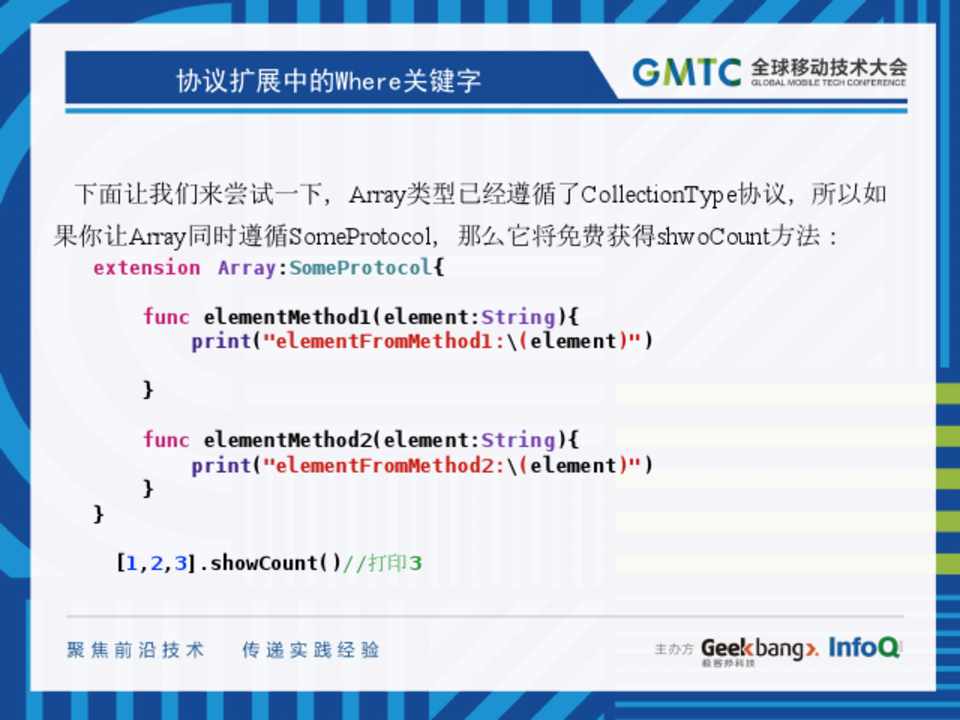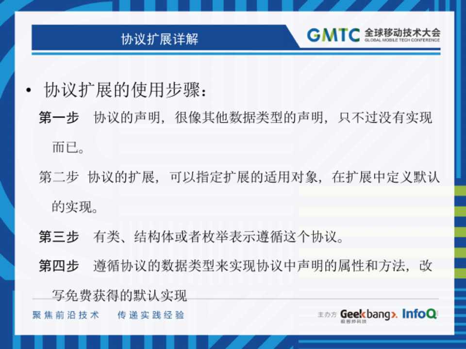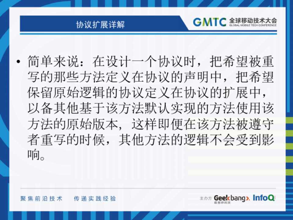 • 简单来说:在设计一个协议时,把希望被重 写的那些方法定义在协议的声明中,把希望 保留原始逻辑的协议定义在协议的扩展中, 以备其他基于该方法默认实现的方法使用该 方法的原始版本,这样即便在该方法被遵守 者重写的时候,其他方法的逻辑不会受到影 响。
