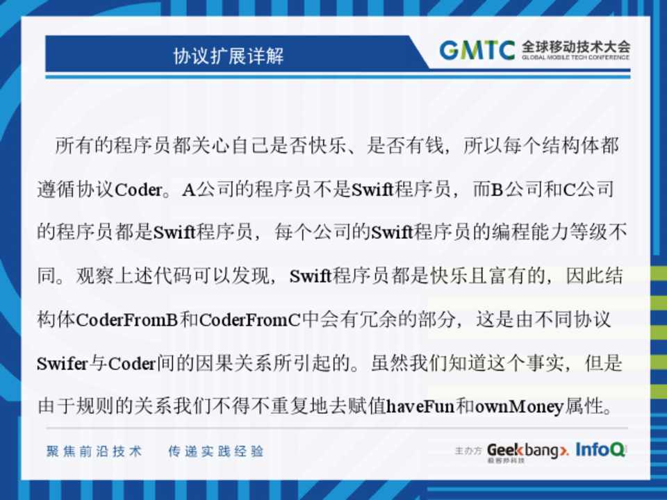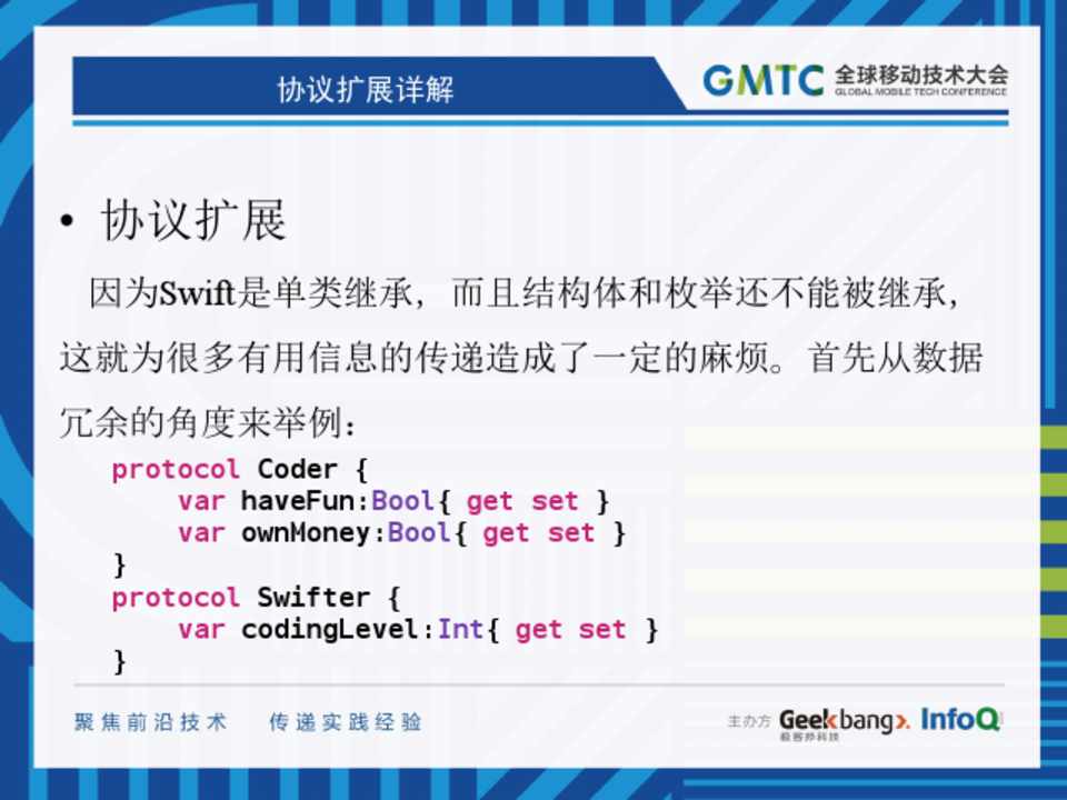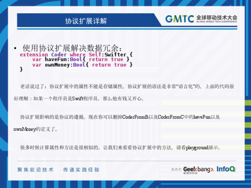 • 使用协议扩展解决数据冗余: extension Coder where Self:Swifter { var haveFun:Bool{ return true } var ownMoney:Bool{ return true } } 老话说过了:协议扩展中的属性不能是存储属性。协议扩展的语法是非常“语言化”的,上面的代码很 好理解:如果一个程序员是Swift程序员,那么他有钱又开心。