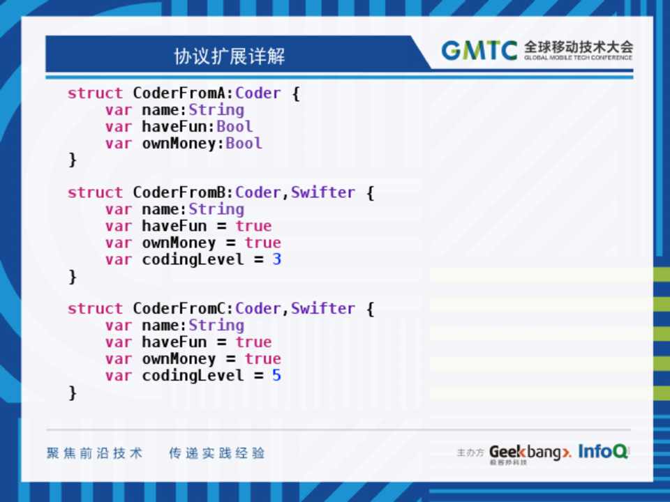var name:String var haveFun = true var ownMoney = true var codingLevel = 3 } struct CoderFromC:Coder,Swifter { var name:String var haveFun = true var ownMoney = true var codingLevel = 5 }