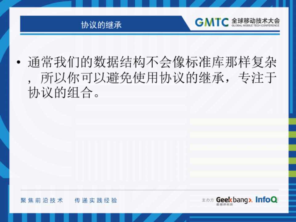 • 协议是功能的最小化描述,粒度要比继承小得多。并 且协议本身不能保存任何数据(协议扩展中不能定义 存储属性),因此遵循一个协议不会带来额外的数据 负担。