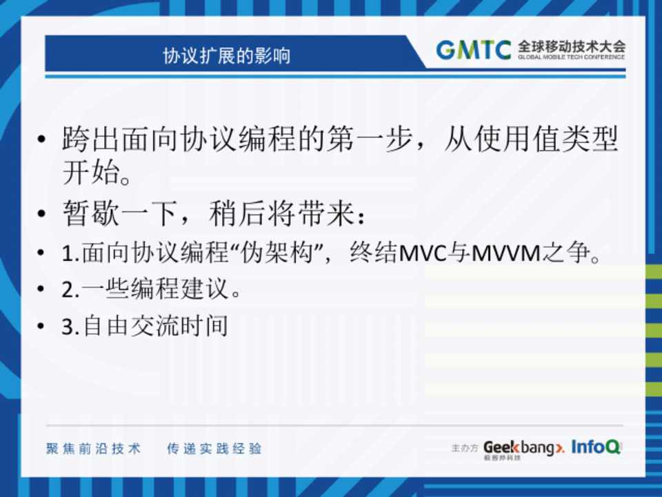 • 面向协议编程有无限的可能性等待发掘,下 面是我个人的一些学习建议,仅做参考:
