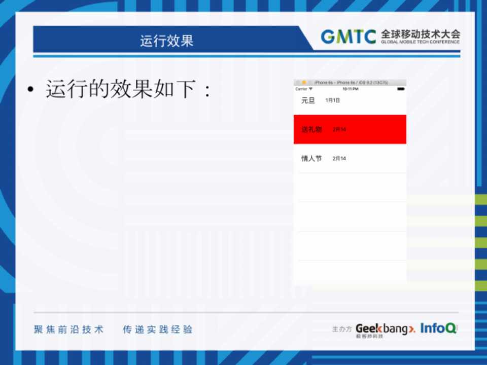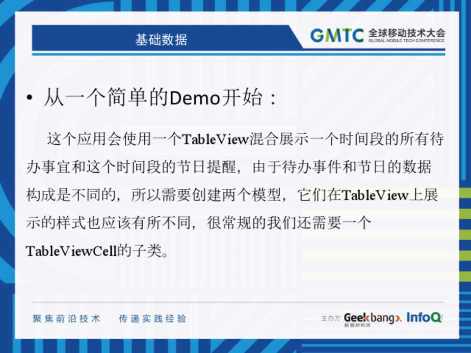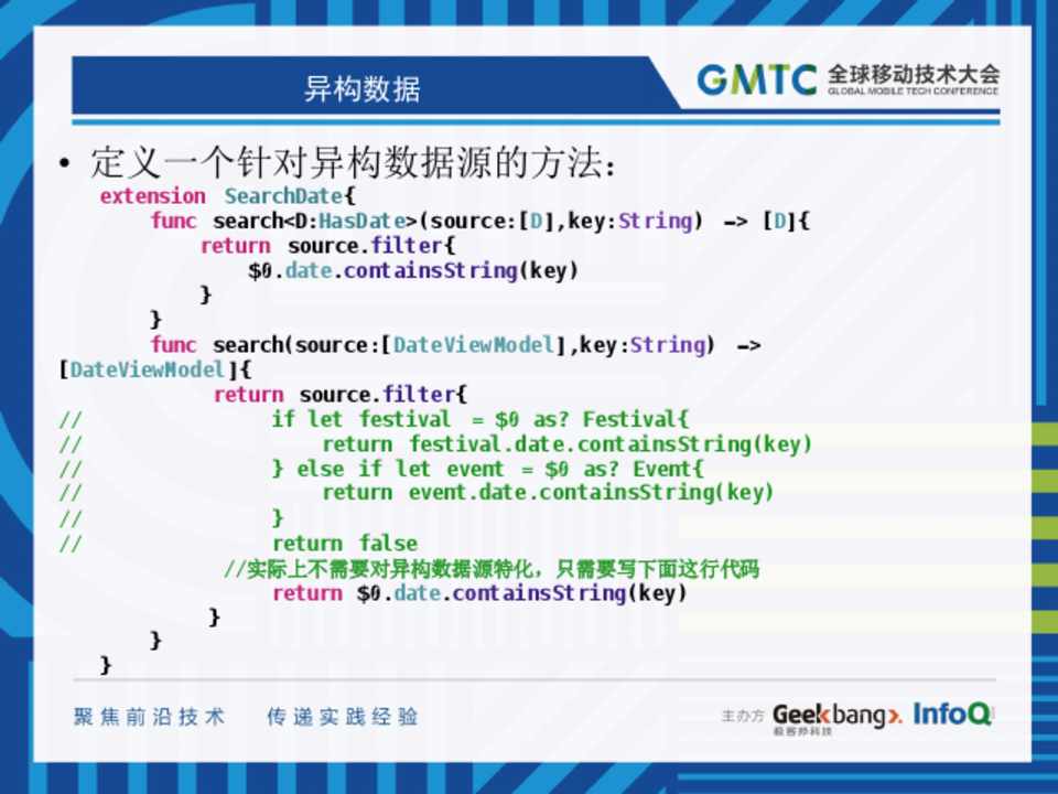 • 在如上的工程中,存在两种视图:UICollectionViewCell、 UITableViewCell。同时也存在两种数据模型:Event和 Festival。数据源和视图自由绑定的话有非常多种情况, 这是一种多对多的关系,所以非常适合使用408号视频中 的异构处理,也就是getData方法中的: