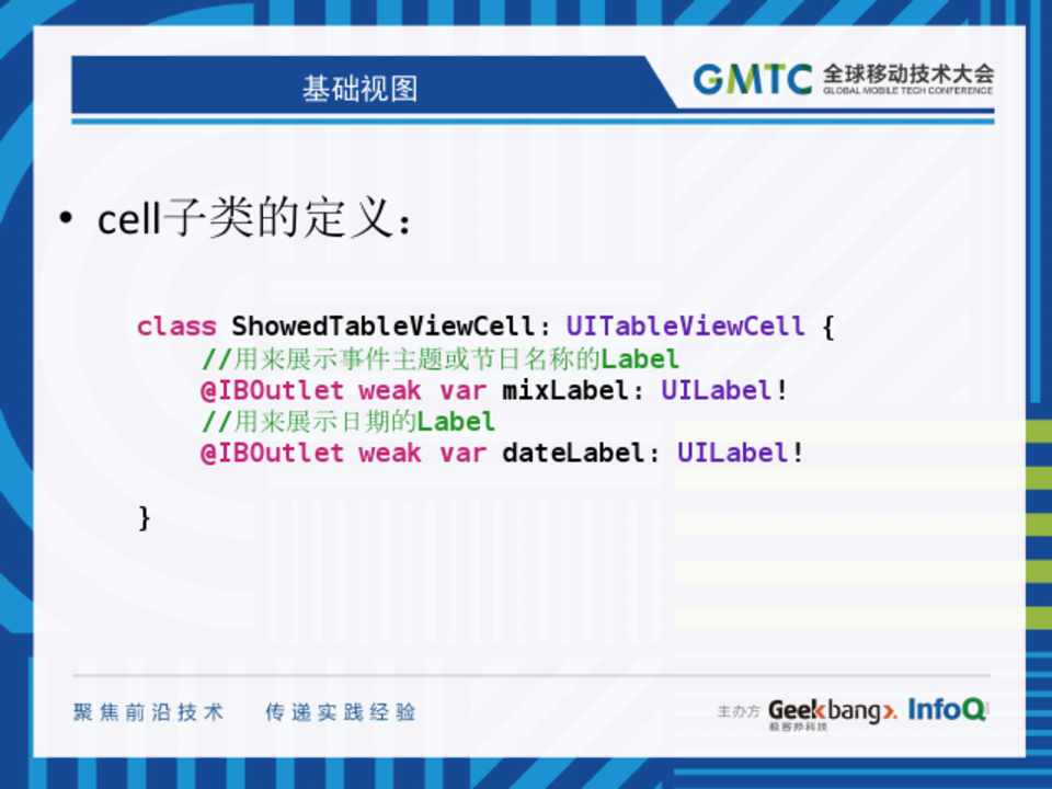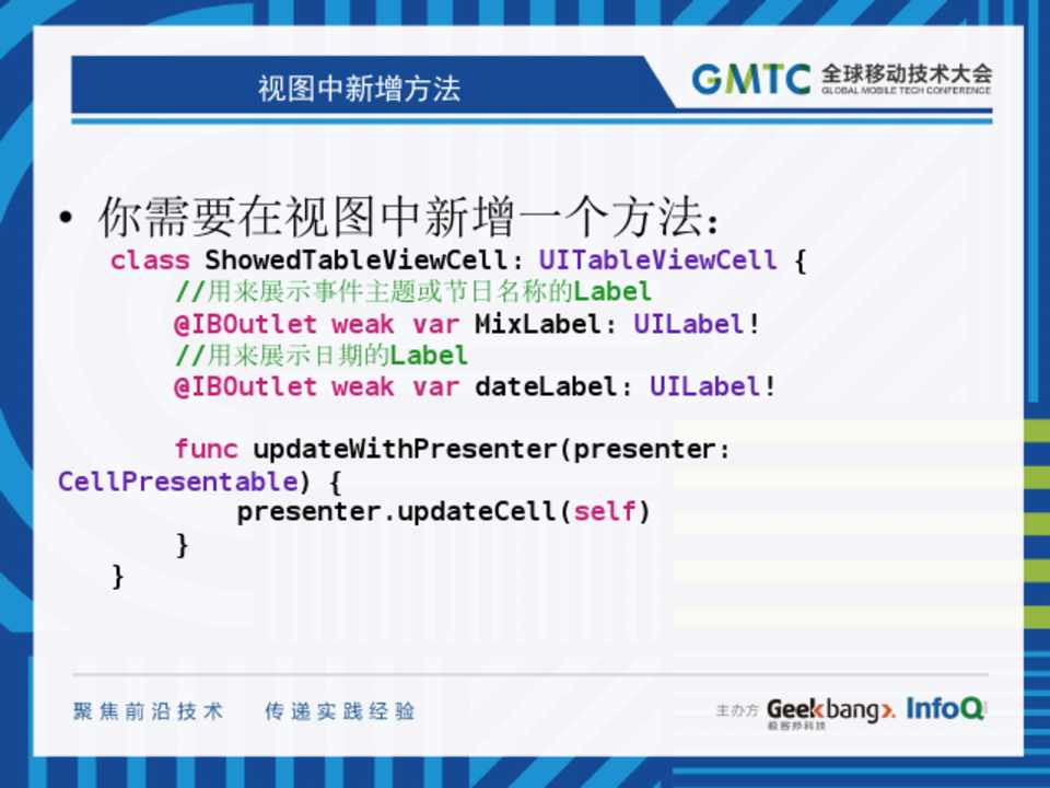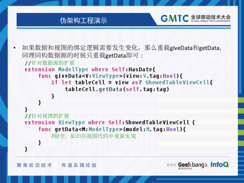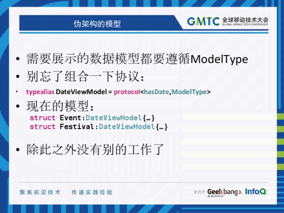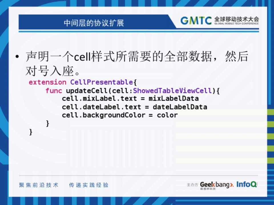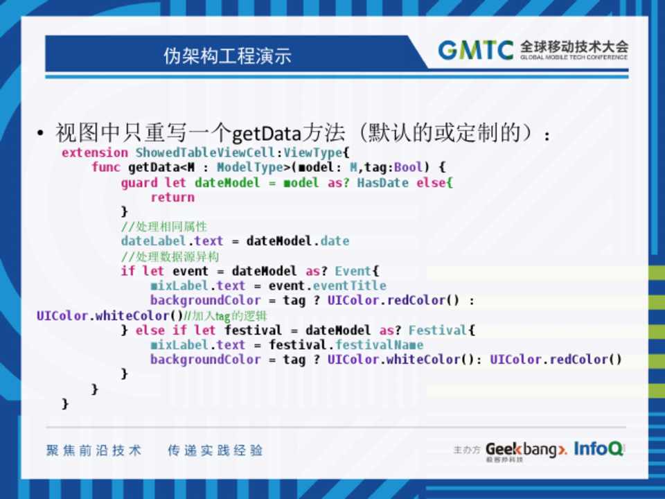 • 视图中只重写一个getData方法(默认的或定制的): extension ShowedTableViewCell:ViewType{ func getData<M : ModelType>(model: M,tag:Bool) { guard let dateModel = model as? HasDate else{ return } //处理相同属性 dateLabel.text = dateModel.date //处理数据源异构 if let event = dateModel as? Event{ mixLabel.text = event.eventTitle backgroundColor = tag ? UIColor.redColor() : UIColor.whiteColor()//加入tag的逻辑
