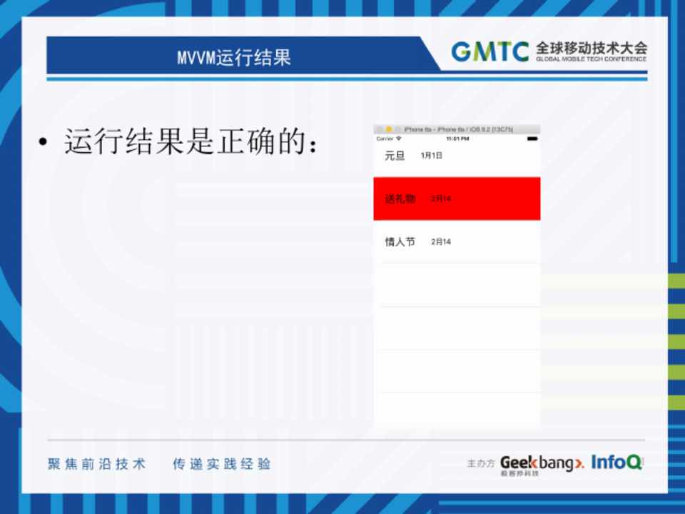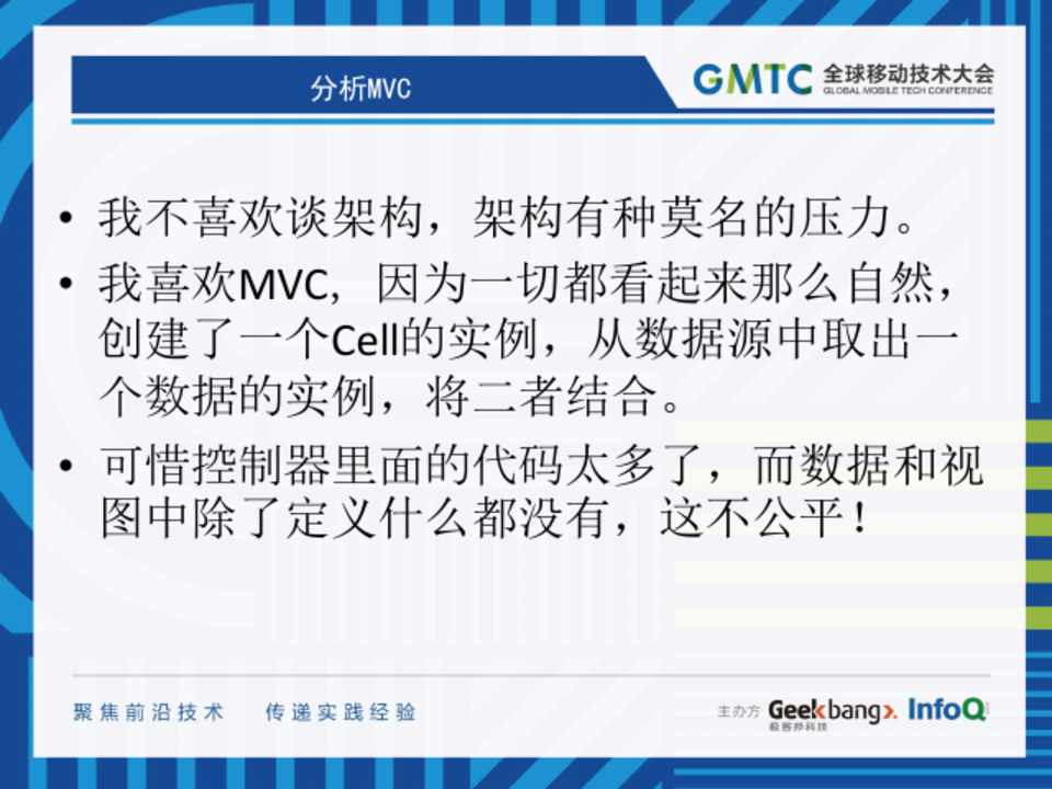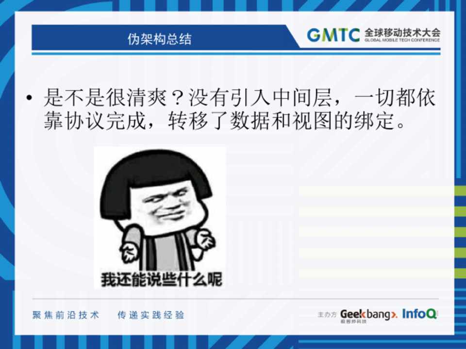 • 是不是很清爽?没有引入中间层,一切都依 靠协议完成,转移了数据和视图的绑定。