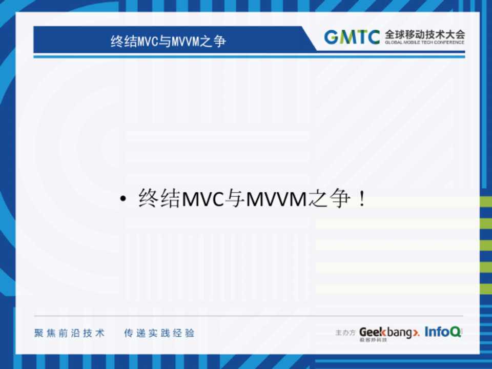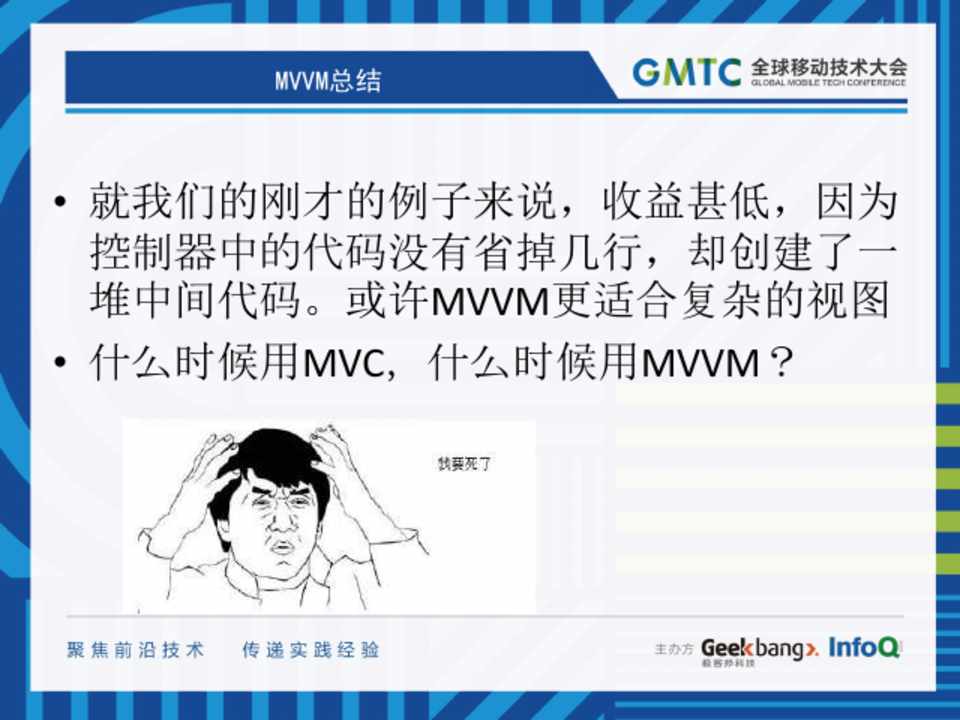 • 就我们的刚才的例子来说,收益甚低,因为 控制器中的代码没有省掉几行,却创建了一 堆中间代码。或许MVVM更适合复杂的视图