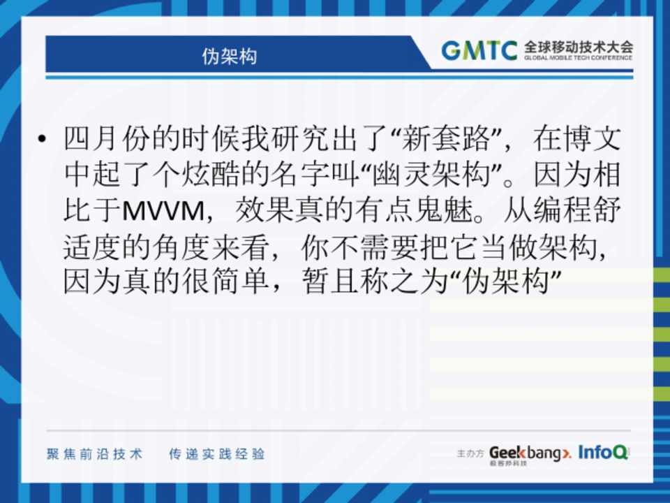 • 四月份的时候我研究出了“新套路”,在博文 中起了个炫酷的名字叫“幽灵架构”。因为相 比于MVVM,效果真的有点鬼魅。从编程舒 适度的角度来看,你不需要把它当做架构, 因为真的很简单,暂且称之为“伪架构”
