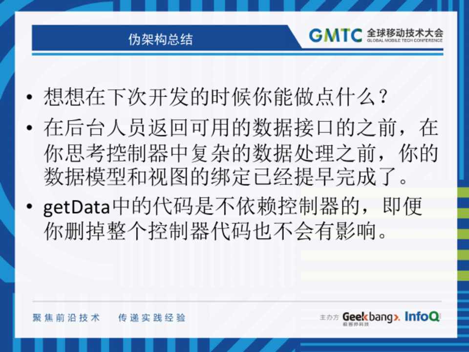 你思考控制器中复杂的数据处理之前,你的 数据模型和视图的绑定已经提早完成了。 • getData中的代码是不依赖控制器的,即便 你删掉整个控制器代码也不会有影响。