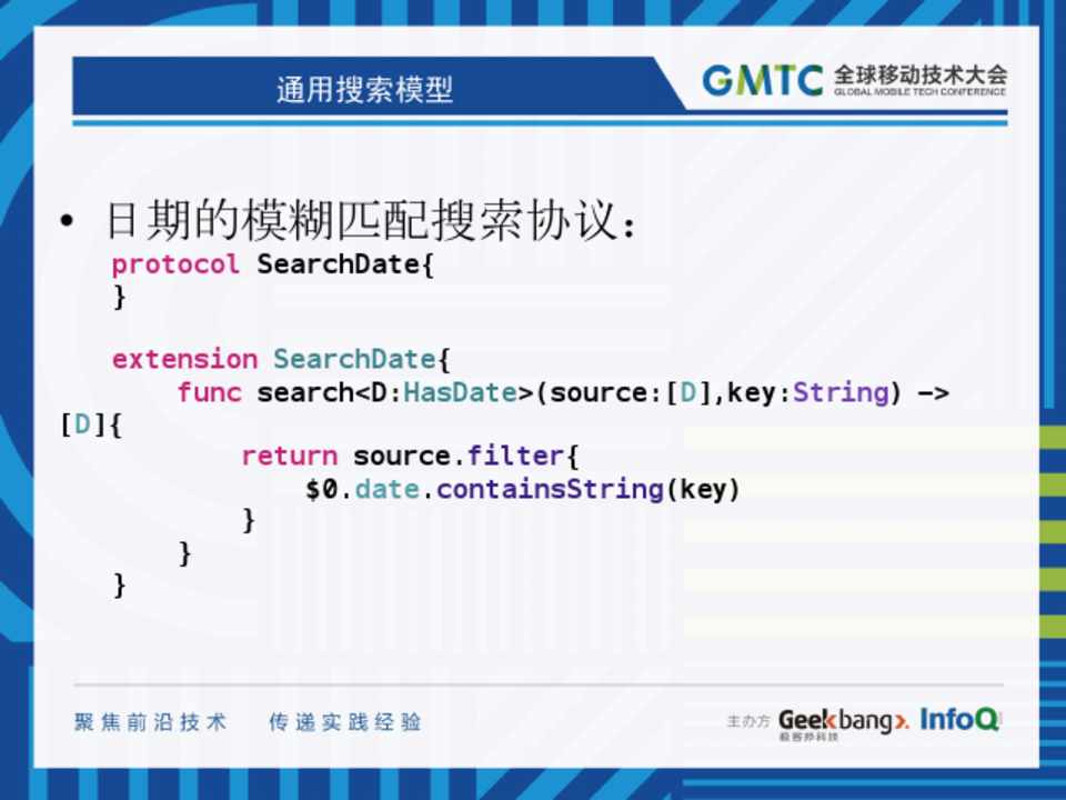 extension SearchDate{ func search<D:HasDate>(source:[D],key:String) -> [D]{ return source.filter{ $0.date.containsString(key) } } func search(source:[DateViewModel],key:String) ->