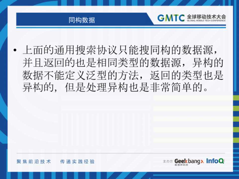 • 上面的通用搜索协议只能搜同构的数据源, 并且返回的也是相同类型的数据源,异构的 数据不能定义泛型的方法,返回的类型也是 异构的,但是处理异构也是非常简单的。