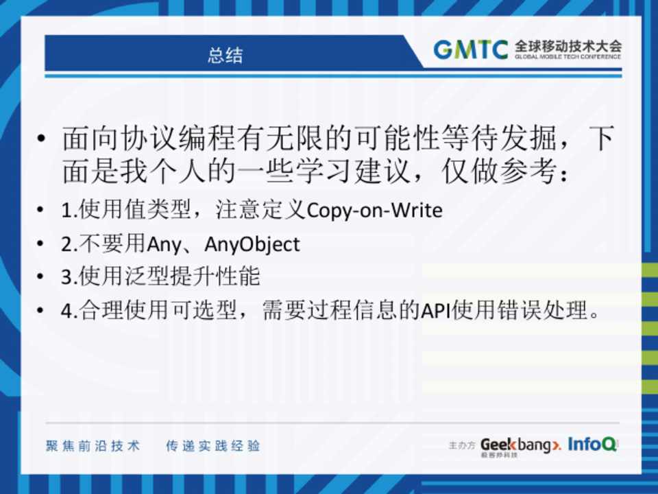 • 1.使用值类型,注意定义Copy-‐on-‐Write • 2.不要用Any、AnyObject • 3.使用泛型提升性能 • 4.合理使用可选型,需要过程信息的API使用错误处理。